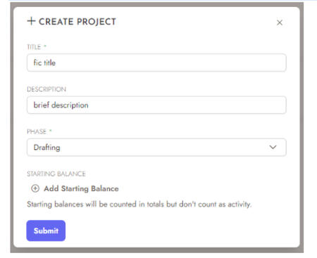 Go to your project tab & click the + NEW icon in the upper right hand side and fill out the fields. If you’ve already started the fic, you can add a starting balance of words so that only new progress will be counted going forwardsYou can add each fic you're working on as an individual project, or if you prefer to work chapter by chapter you could put each chapter as a project. The possibilities are endless!