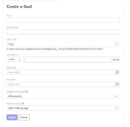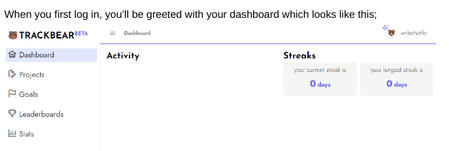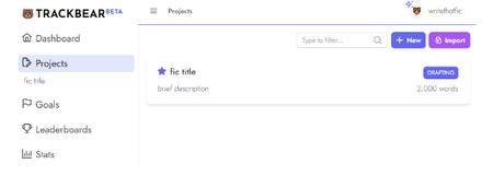 On the left you have the following options;Dashboard - takes you to what we’re currently looking at. Once you start adding updates, it’ll update your current writing streakProjects - you can add each fic you’re working on as a separate project and set word count goals for eachGoals - set yourself a writing goal! It could be monthly or annual. You could choose to work for a certain amount of time, or write a set amount of wordsLeaderboards - write as part of a group! Depending on how it’s set up, each of you can work towards one community goal, or each of you strive towards the same goal. You’ll be able to see each other’s progress throughout the month!Stats - This shows your lifetime total words at the top, and a graph of when you updated and how much by below thatHow to add a new project: