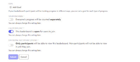 Fundraiser mode: if toggled on, everyone's progress will count towards the same overall goal (example 5k together instead of 5k each)Decide whether you want people to be able to join or not (if not you will be the only member on the board)